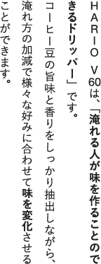 Twenty-four years later, HARIO started the development project again. Usually, ribs of the dripper extended straight vertically. This caused the paper to closely adhere to the dripper wall between neighboring ribs, making it difficult to let the air through. We noticed that it decreased the efficiency of extraction. To make a path for the air by floating the paper, we added a twist to the rib shape, and also made a single large hole in the bottom. This gave a birth to a dripper which prevents hot water from staying too long in it, and enables users to control the speed of pouring water to brew coffee to their desired taste ? a lighter taste if water is poured quickly, and a stronger and deeper flavor if poured slowly.