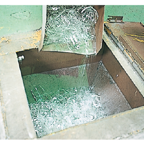 製品化されなかったガラスは集められ、炉で溶けやすいように同じ大きさに粉砕し、リサイクルします。