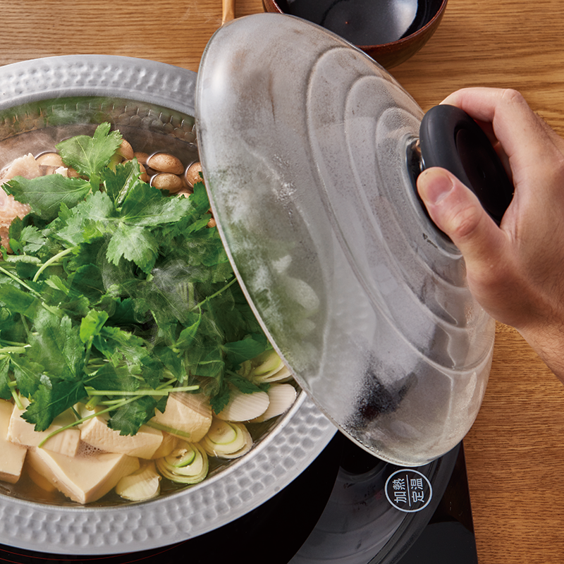 たっぷり具材が入るドーム型のフタは、透明な耐熱ガラス製で調理中、中の様子が見えて安心。