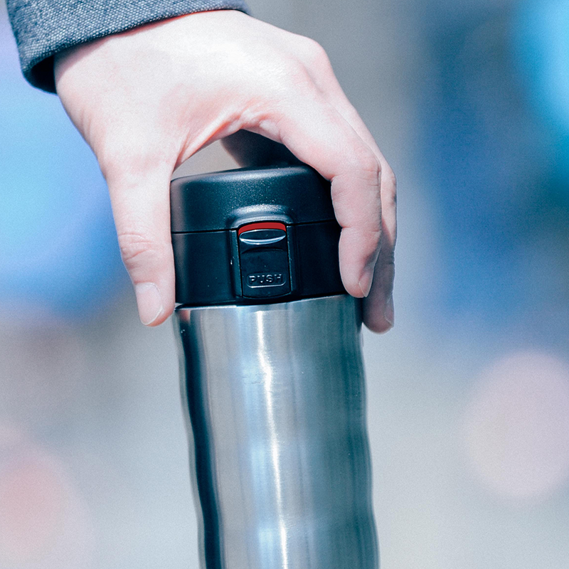 ロックスイッチ付きのフタを採用。移動中も片手でさっと飲めます。