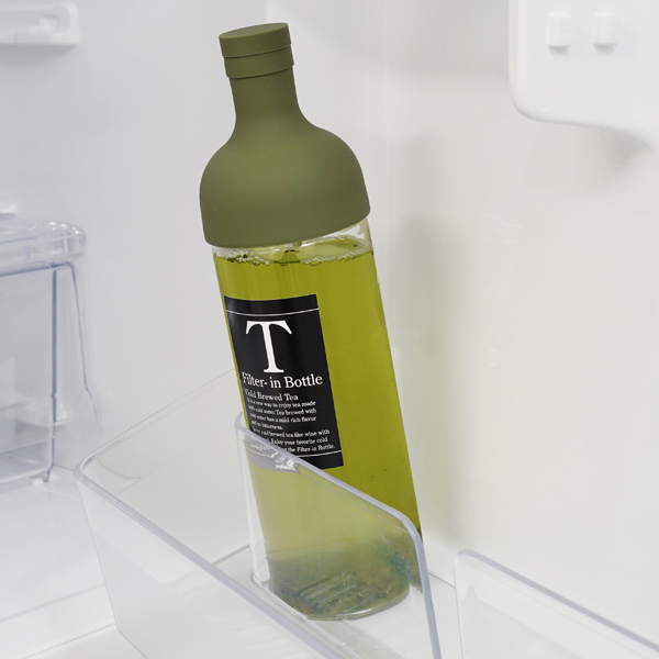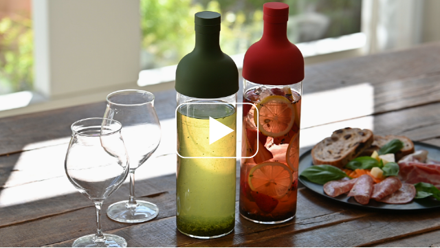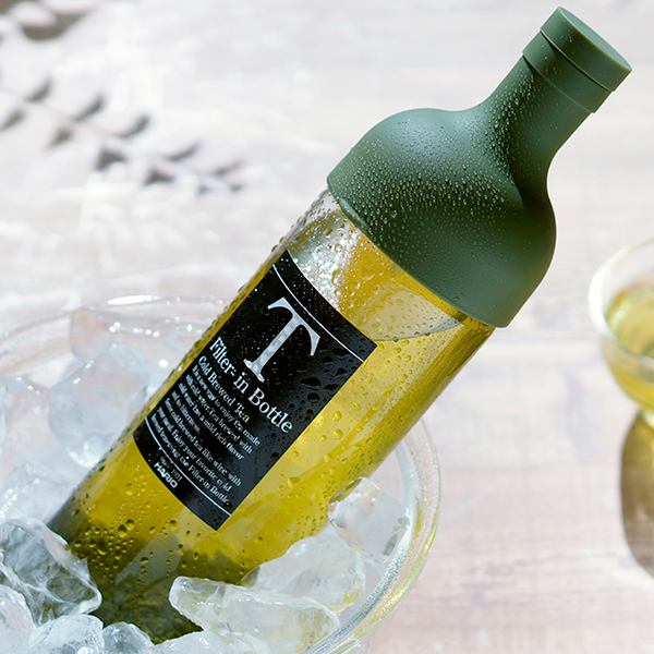 ワインのように食事の時に水出し茶を愉しんでいただきたいという思いからできた、ワインボトル型のフィルターインボトル。 注ぎ口部分にフィルターがセットされているので、そのまま注げます。