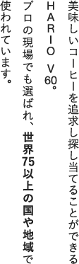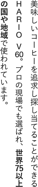 HARIO received Japan’s Good Design Award in 2007 for the V60 made from plastic and ceramic that had been completed by that time. Since a brewer who used the V60 won first prize in the 2010 World Brewers Cup, the V60 has spread around the world through word of mouth. Today, the V60 is used by many baristas and coffee enthusiasts in world coffee competitions or cafes as the dripper with which they can directly express coffee taste.