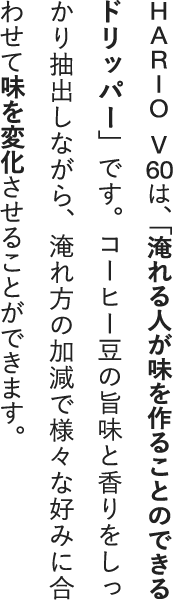 Twenty-four years later, HARIO started the development project again. Usually, ribs of the dripper extended straight vertically. This caused the paper to closely adhere to the dripper wall between neighboring ribs, making it difficult to let the air through. We noticed that it decreased the efficiency of extraction. To make a path for the air by floating the paper, we added a twist to the rib shape, and also made a single large hole in the bottom. This gave a birth to a dripper which prevents hot water from staying too long in it, and enables users to control the speed of pouring water to brew coffee to their desired taste ? a lighter taste if water is poured quickly, and a stronger and deeper flavor if poured slowly.