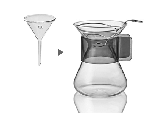 HARIO also entered the area of glass tableware, and wondered if we could make a fuss-free dripper that produces flavor close to cloth-filtered coffee, which was said to be classic-style coffee, through utilizing the heat-resistant glass technology we had accumulated. During the trial and error process, we tried to drip coffee with cone-shaped funnels for laboratory use that were in the glass test room of the company. In 1980 HARIO launched a paper dripper that extracted coffee by slightly floating the paper like cloth, but regrettably it did not spread.